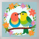 Två ljusa färgader sitter på ett gren som omges av blommor, symboliserar kärlek, natur och lycka under våren. Den lekande grafiken visar på ett sunt färg och ett sunt känslor.