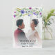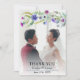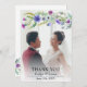 Det här fantastiska tackkortet är perfektens sätt att uttrycka sin tacksamhet till gästerna i bröllop. Kortet har ett vackert foto av paret lycklig, tillsammans med ord "Tack", deras namn och dagen för deras speciella dag. Kortets övre del är försedd med en fantastisk blommigt arrangemang om vår vattenfärgade vilda blommor i skuggor av lila och blått, kompletterad med blåaktiga löv av grönt. Kortets baksida visar samma fantastiska blommigt i grund, vilket ger perfektens baksida ett hjärtligt tack. Det här kortet lämnar säkert ett bestående intryck på dina gäster och är som ett omhuldat minne av din speciella dag. Skyddet har varit designat med vissa tillgångar från Freepik.com