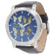 Två typer av färgade fjärilar och två månader med fläckar, tillsammans med en vattenpelare. Silvery linjer för siffrorna på klockan ansikte över en djup, himlar blå bakgrund.