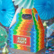 Bygg-leksak - byggnad blockerar tegelstenar med lutad rektangel mönster av rött, brunt, gult, orange, grönt, ljusblått och mörk blått primärt reflexarmat färg för ett barns födelsedagsfest.