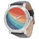 Abstrakt illustration av färgstarka (rött, orange, blått, turkos, marint blått) sol-strålar med böjd geometrisk dekoration för rand