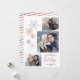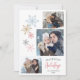 Det här moderna 4-fotojulkortet ger färgad snöflingor i blått, guld, rosa och grått. Hälsning "Happiest Helgdagar" visas i en kombination av böjd och handskriven stil-text. Anpassa med familjens foton, namn och år.