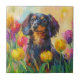 Den här charmerande målningen har ett vackert sitta bland ett svidande fält av färgstarka tulpaner, som fångar en lekfull och hjärtslitande scen. Rik färg och uttryckliga penseldrag gör det till en perfekt biet för hundälskare och skändning med vår som tema.
