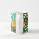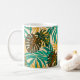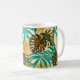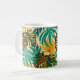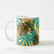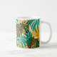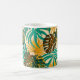 Färgfläckfritt mönster med tropiska växter och kaffemugg