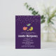 En babyduschinbjudan med vykort med en trio söta och vismliknande handdragna fåglar. Två av fåglarna står tillsammans med lite grönt gräs träd mellan fötterna. En annan blå fågel flyger upp i luft mellan dem. Ställ in på en lila bakgrund. Faux ro-guld konetti-bild längst upp.