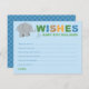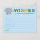 Anpassningsbar "Önskemål"-kort för en babydusch innehåller ett djungeldjurstema med en elefant. Polka punkt och rand mönster accents. Ljust himlar blå med grönt, orange, blått, brun, och grått färg - perfekt för ett pojke!