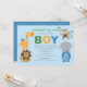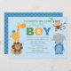 Djurets vänner i baby, bl.a. en lejon, giraff, fågel, apa, elefant och hippo, ram denna moderna och söta safari, den så kallade babyduschinbjudan. Polka punkt och rand mönster accents. Ljust himlar blå med grönt, orange, blått, brunt, brunt och grått färg. Perfekt för pojke!