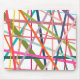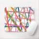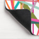 Den här musknappen har en geometrisk utformning av utspridd linjer i blommigt färg - skuggor av rosa, orange, gult, blått och grönt.