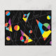 Vykort med en modern abstrakt utformning av färgstarka trianglar och cirklar i färg, rosa, blått, rött och grönt.