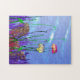 Jigszasmunstycket med min ursprungliga 3d-teckning på en undervattensscen med två färgad angelfisk som simmar ovanför sjögräs och sten.
