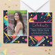 Gå in i 1980-talets pulserande värld med vår återinspirerade studenten-inbjudan! Mot en bakgrund av djup marin blått, spricker rosa, elblått och limegrön abstrakt som påminner om tidsålderns ideotetik. Ett omhuldat foto fångar kärnan av din prestation, utstrålar pride och prestation. Vänd inbjudan om du vill hitta ytterligare två ögonblicksbilder som visar den resa som ledde till detta betydelsefulla tillfälle. Mitt i livliga nyanser blir vårt inbjudningsmeddelande: