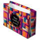 En stor presentväska med färgstark bakgrund i abstrakten. Fetstigt och spännande färg - rosa, blått, orange med mera.