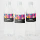 Etiketter för händelsens vattenflaska med färgstark bakgrund av abstrakten. Fetstigt och spännande färg - rosa, blått, orange med mera.