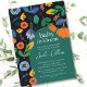 Modern babyduschdesign i baby i blomman med stora, feta, färgstarka blommor i orangens gult och blå med en modern båge som visar din party-info.