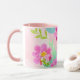 Mugg har en feminin och vacker färgbukett av blommor med olika utseende i nyanser av rosa, orange, gult och vitt, som kompletteras med grönt och akvatiska löv på mjuk rosa.