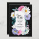Ett sjudande svart-kantat blommigt bröllop spara-till-datum-kort med rosa och lila blommor, vita daisy och grön omgivning av texten. Perfekt för par att planera ett trädgårdsbröllop.