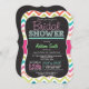 Inbjudningskort för möhippan med söt krita ser typsnitt ut på rosa, teal, grönt, blått, orange och vit chevron rand mönster. Vintagen känner sig hackad typsnitt på coolans svarta bordsbakgrund med som ritar i inslag.