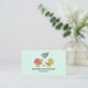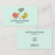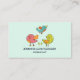 Ett affärskort med en trio söta och vismliknande handdragna fåglar. Två av fåglarna står tillsammans med lite grönt gräs träd mellan fötterna. En annan blå fågel flyger upp i luft mellan dem.