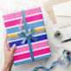 Färgfull Rand Vivid Födelsedagsfest Wrapping Papper. Modern och levande, skarp design med blå, gult och rosa rand. Underbar för födelsedagsfirande för barn eller vuxnor, picknic, Påsk,..