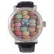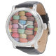 Dessa sötade konfektioner som är baserade på Fransk fylls med ett smaklöst centrum för att skapa en söt kaksmörgås. Den här staplade regnbågen i färg betyder olika smakliga smak. Bilden har en lätt "målad" känsla när man tittar närmare på den.