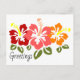 Skicka hälsning till alla med en trio söta hibiscus blommor. Den har röd, rosa och orange hibiscus blommor med ett sött handskrivet stil-teckensnitt.
