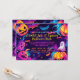 Den här inbjudan från Halloween fest har en lekfull och dynamisk design där söta Halloween-tecken cirkulerar runt den centrala texten och skapar en roligt och ett festligt ram. Längst upp och längst upp på inbjudan finns glada pumpor med vänskapliga griner, medan det vackra spöken flyter omkring med uttryck från lycklig. En liten fladdermus fladdrar i närheten, vilket ökar den lekande talesättet. Tecknen ordnas i ett runt mönster, omger huvudtexten och bildar ett livligt, färglöst gräns. Bakgrunden är en fet svart färg som gör att det pulserande färgen - blues, Electric lila och bright pinks - blir ännu mer populärt. Kombinationen av vibrerande nyanser mot mörkens bakgrund skapar ett öga-fångstande och energiskt utseende som är perfekten för ett barns Halloween firande. I mitten av ram står det i den lekfulla texten "Du är inbjuden till ett färgstarkt Jack-O"-Lantern Halloween Bash" i ett vismiskt typsnitt som matchar den vackra roligten. Arrangemanga på de färgstarka tecknen runt texten ritar öga till mitten och skapar detaljerna. Baksidan av inbjudan fortsätter den svarta bakgrunden och ger utrymme för OSA detaljer eller ytterligare text, samtidigt som det livliga temat behålls. Med sin arrangemanga cirkel av söta pumpor, spöken och fladdermus skapar denna design en lekfull upplevelse och inbjuder till perfekt för ett barns Halloween fest.