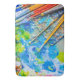 Bild av en färgfull målarpalett, ett antal penslar och en palett knivar. Blått och grönt färg har företräde. Vackert vibrerande badmatt av ett slag för alla.