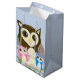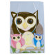 Denna vackra barnpresentväska har tre färgstarka Ugglor, en rosa, en brun och en blå. Perfekt att fylla med födelsedag presenter för den speciella lilla personen.