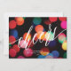Den här moderna helgdag NON-fotokort har en färglös bakgrund (suddigt helgdag ljus) med hälsning "cheers" i ett vitt kalligrafiskt skript på framsidan. På baksidan finns samma bakgrund (som kan tas bort om du vill). Anpassa designen ytterligare genom att lägga till ett foto och/eller text på baksidan!