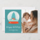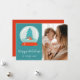 Glad helg, vitt skript, färglös reflexspegel från mitten av århundradet illustrerade snö globe med Julgran och gåvor, blått helgdag-fotokort. Kortets baksida, en solid koordinerande röd färg.