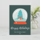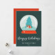 glad helg, vitt skript, färglös återtro från mitten av århundradet, illustrerad snö globe med Julgran och gåvor, rustik grönt helgdag card. Kortets baksida, en solid koordinerande röd färg.
