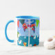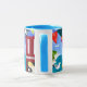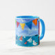 En vit ring mugg med pulverblå fälg och handtag och en handmålad papper kollage av en ljusstark och färgstark havsbotten. Se även matcha hälsningskort, poster, presenter och kläder.