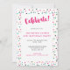En skarp och färgstark partiinbjudan med en spridd triangel med flera färgader konetti mönster och ord 'högtidlighållen' i shock rosa-penselteckensnitt. Den färglösa konfekturen fortsätter längst bak för extra roligt. Denna inbjudan är perfekt för en födelsedagsfest eller firande och är lämplig för ett barn eller en vuxen.