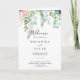 Det här färgstarka tropiska blommigten är perfekt för ett målbröllop. Utformningsfunktionerna illustrerar vitt, gult, rosa, blommor med vackert vattenfärgsfärgade grönt löv, inspirerande elegans. Inkludera ett citattecken eller ett kort-meddelande, serviceordning, bröllopsfest och tackmeddelande.