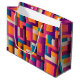 En stor presentväska med färgstark bakgrund i abstrakten. Fetstigt och spännande färg - rosa, blått, orange med mera.