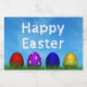 Glad påsk illustration med färgstarka, färgade Påskägg i gräset med blå himmel i baksidan och "Glad påsk"-typografi med vita moln.