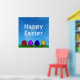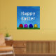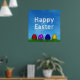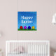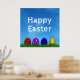 Glad påsk illustration med färgstarka, färgade Påskägg i gräset med blå himmel i baksidan och "Glad påsk"-typografi med vita moln.