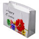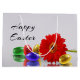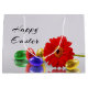 Glad påsk illustration med färgstarka folier av chokladförpackade Påskägg och en röd gerbera-blomma på en ljusvit grått-bakgrund.