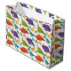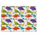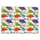Insamling av färgstarka dinosaurier i sömlös mönster över vit bakgrund.