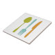 Den här reflekterande keramiska plattan, med dess köksredskap (gaffel, knivar och sked) i en kombination av turkosblått, avokado grönt, orange och mörk blått, kommer att se fantastisk ut i ditt ryggsplash eller på din motfot.