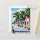 Säg hej med det här vackra semestervykortet med en illustration av bachystugor på en brädgång vid havet omgiven av handflatan träd. En söt färglös, impastoolja stil ai-målning.