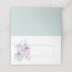 Bröllop-vikande platskort i vitt och lätt teal med en vacker illustration av en lila- och tealbukett av blommor. Framsidan är redot att anpassa sig för hand för varje gäst vid bröllop.