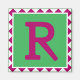 Huvudstaden brev "R" görs i Fuchsia-färg på en ljus grönt. Plockorna i gräns ligger vid fuchsia-färg i brev och har en diamantform runt kant i fechsia och vitt.