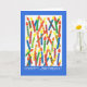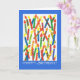 Ett födelsedagskort i öga, med ljusa färgader på vit bakgrund med ljusblå gräns, från ett handmålat pappert kollage av Judy Adamson. Känn dig fri att anpassa insidermeddelandet.
