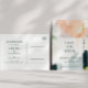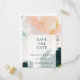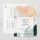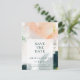 Detta färgglada abstrakta spara datum postkort är perfekt för ditt unika moderna boho-bröllop. Handmålad med texturerade penseldrag i mörkgrön, persika och senap, allt överlagt med en minimalistisk genomskinlig fyrkant, kommer säkert att ge din tillställning en enkel men rustik bohemisk känsla.