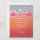 En fantastisk övergång från röd till lavendel skapar bakgrunden för ett band där blommor och en gul fågel vilar. Orden "baby shower" kan raderas vilket gör denna inbjudan flexibel.