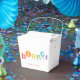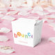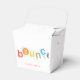 Presentkartongen för studsmatteparty har en könsneutral, regnbågsfärgad studsmattegrafik med hoppande bokstäver i rött, orange, gult, grönt, blått och lila med ett redigerbart utrymme för åldern inuti O:et. Det finns också en rad med redigerbar text under grafiken för ett personligt meddelande till gästerna. Matchar perfekt med studsmattekalas-kollektionen av Stacey Meacham.