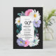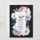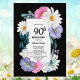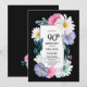 En livfull inbjudan till 90-årsfest med svart kant och blommor, med rosa och lila blommor, vita prästkragar och grönska runt texten.