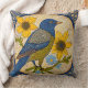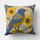 Färgglad illustration av en fågel som sitter på en gren, omgiven av gula blommor och blå prästkragar. Konsten har ett prickigt mönster och en harmonisk blandning av blå, gul och jordnära toner som skapar en glad och livlig komposition.