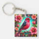 En livfull fågel med färgglada fjädrar sitter på en gren bland utsökt detaljerade rosa blommor.